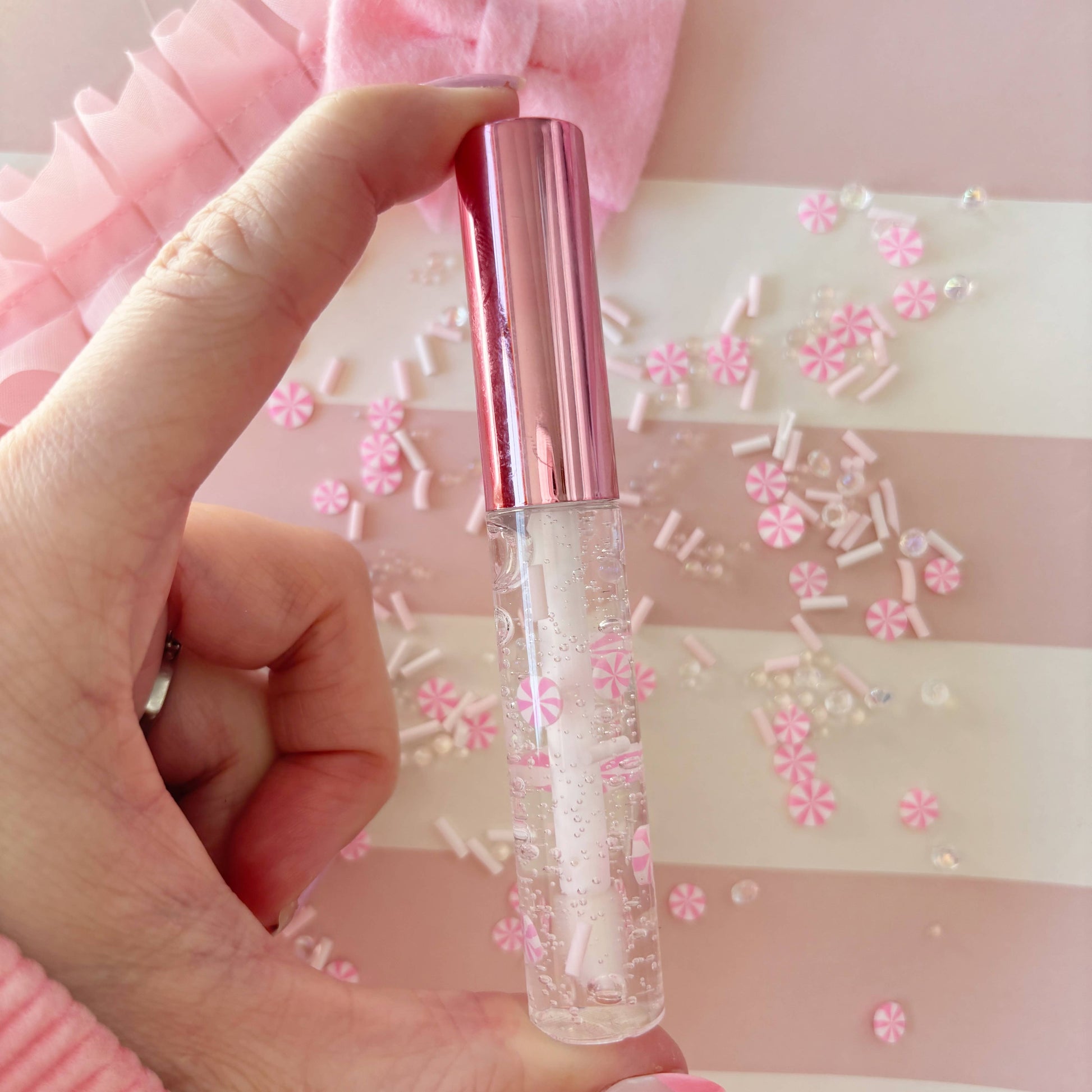 Ingredients: Hydrogenated Polyisobutene (and) Ethylene/Propylene/Styrene Copolymer (and) Butylene/Ethylene/Styrene Copolymer, Coconut Oil, Sweet Almond Oil, Vitamin E, mica/vegan liquid coloring (and) flavor oil. party favor, stocking stuffer, teen gift, girl gift, clear gloss, lip moisturizer, mints, pink, rose gold